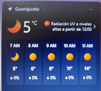 La madrugada de hoy martes la ciudad de Guanajuato amaneció a cinco grados centígrados, de acuerdo a los registros del Servicio Meteorológico Nacional, por lo que la recomendación de las autoridades de la Secretaría de Salud es que todas las personas salgan muy bien abrigadas a sus centros de estudios o a su trabajo.