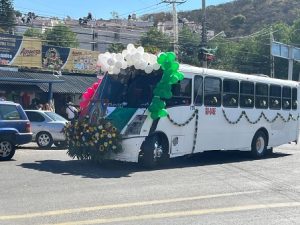 Con globos alrededor del frente, en los colores verde, blanco y rojo, y sobre el cofre un gran arreglo floral resaltaba la imagen de la virgen, ante la admiración de las personas.