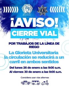 Entre tanto, en la calle Banqueta Alta, a la altura de la glorieta UNESCO, la circulación y retorno será por la glorieta Universitaria a partir del miércoles 28 de enero al viernes 30 de enero, por lo que piden que se utilicen vías alternas.