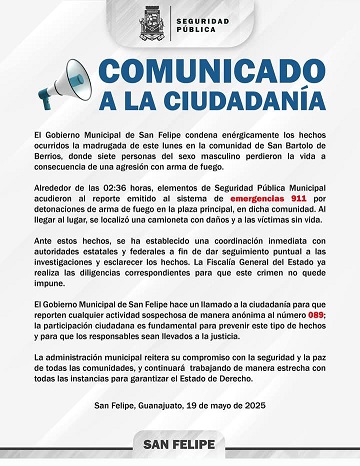 Nuevamente el estado de Guanajuato tuvo el registro de siete personas asesinadas en la comunidad de San Bartolo de Berrios, perteneciente al municipio de San Felipe, en lamentables hechos ocurridos la madrugada de este lunes en dicha demarcación.