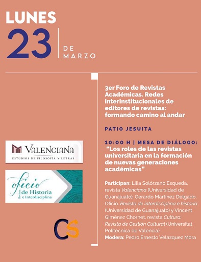 En la mesa “Los roles de las revistas universitarias en la formación de nuevas generaciones académicas”, participarán Lilia Solórzano Esqueda (Revista Valenciana, de la UG), Gerardo Martínez Delgado (Oficio. Revista de interdisciplina e historia, de la UG) y Vincent Giménez Chornet (Cultura. Revista de Gestión Cultural, de la Universitat Politècnica de València).