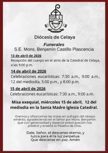 “Se les comunica que S.E. Alonso Benjamín Castillo Plasencia, Obispo Emérito de Celaya, ha partido a la casa del Padre. Nos unimos en oración por su alma y por su familia.