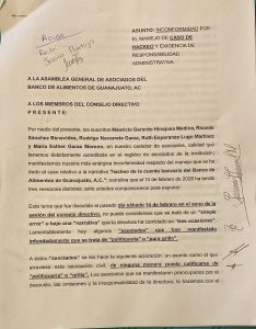 En un escrito que está en poder de Mosaico Informativo de Guanajuato, se hace referencia los denunciantes afirman que hubo “descuido, omisiones, irresponsabilidad y negligencia en que incurrió la titular de la dirección ejecutiva en el manejo de los recursos financieros y el patrimonio de nuestra asociación”.