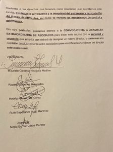Los denunciantes exigen que el Consejo Directivo ordene la revocación inmediata de facultades bancarias ante el banco emisor y la cancelación de su acceso a la banca en línea por parte de la directora y se designe a un asociado comisionado por la asamblea para la gestión de nuevas credenciales.