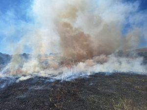 Mientras tanto, el personal de Bomberos SIMUB continuaba trabajando en el incendio de pastizal frente a Siemens, a un costado de la báscula.