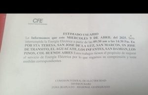 De acuerdo a la CFE, la suspensión del servicio para este miércoles afectará a los habitantes de las comunidades de San José de la Luz, Santa Teresa, San Marcos, San José de Tránsito, El Aguacate, Los Infantes, San Damián, Los Pinos y Colonia Buenos Aires.