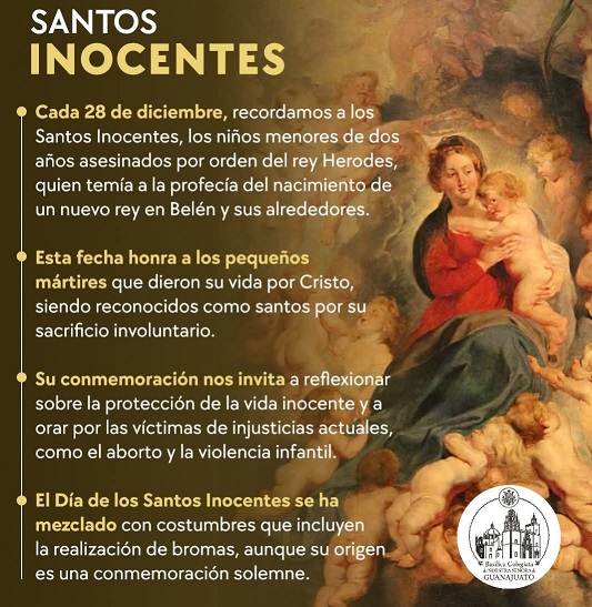 Jesús fue salvado porque un ángel advirtió a José en sueños como lo narra Mateo 2versículo 13, “levántate, toma al niño y a su madre y huye a Egipto; pero muchos otros niños no escaparon, aquí está lo impresionante, la iglesia considera a esos niños como los primeros mártires del cristianismo, aunque no conocieron a Jesús, no predicaron, no eligieron morir, murieron solo por existir, por eso se les llama Santos Inocentes desde el siglo cuarto”.