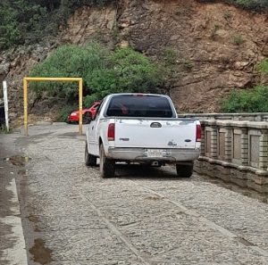 Pero no solamente se tiene ese problema en este vaso de captación, también la cortina está deteriorada. El camino por el que pasan vehículos ha provocado que haya baches, también se tiene grafiteada una placa que está colocada en este lugar.