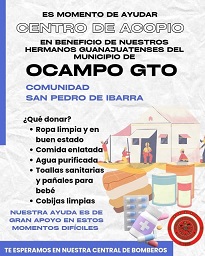 Entre tanto, esta tarde, los Bomberos de Guanajuato invitaron a la población para que se solidaricen con las familias que radican en la comunidad de San Pedro de Ibarra, municipio de Ocampo, que sufre por las fuertes lluvias registradas ayer por la noche, y que ocasionaron el desbordamiento de las Golondrinas, que inundaron dicha localidad.