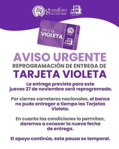 La administración municipal de Guanajuato que encabeza Samantha Smith, anunció ayer por la noche que no serán entregada la tarjeta violeta que estaba prevista hacerse el próximo jueves 27 de noviembre.