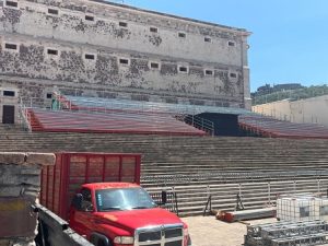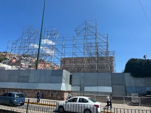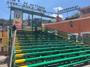 En plazas de la ciudad de Guanajuato ya se comienza a respirar el ambiente Cervantino, y por ejemplo, en San Roque, donde nacieron los Entremeses Cervantinos, que dieron pie al FIC, ya tiene listas y bien pintadas las gradas donde el público podrá disfrutar de los eventos previstos este año.