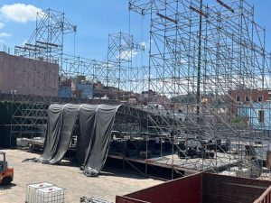 Trabajadores contratados para montar el escenario en la explanada de la Alhóndiga de Granaditas para los eventos que están programados para presentarse dentro del 53 Festival Internacional Cervantino, (FIC), realizan las labores para tener todo listo para la ceremonia inaugural que será el próximo viernes 10 de octubre.