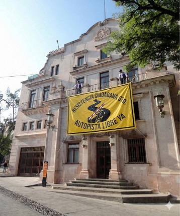 Hoy lunes por la mañana acudieron los manifestantes de la de Resistencia Ciudadana Guanajuato quien literalmente “tomaron” palacio de gobierno y colocaron la enorme manta con la leyenda “Autopista libre, ¡ya!”.