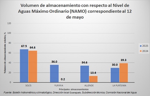 Refirió que de acuerdo a CONAGUAN, entre el 1 de abril y 12 de mayo del presente año el volumen de almacenamiento, de datos la presa, se redujo en un 4.4%, lo cual se traduce en un volumen de agua de 32 hectómetros cúbicos, algo así como 2 veces la capacidad total de la presa Peñuelitas, ubicada en el municipio de Dolores Hidalgo.
